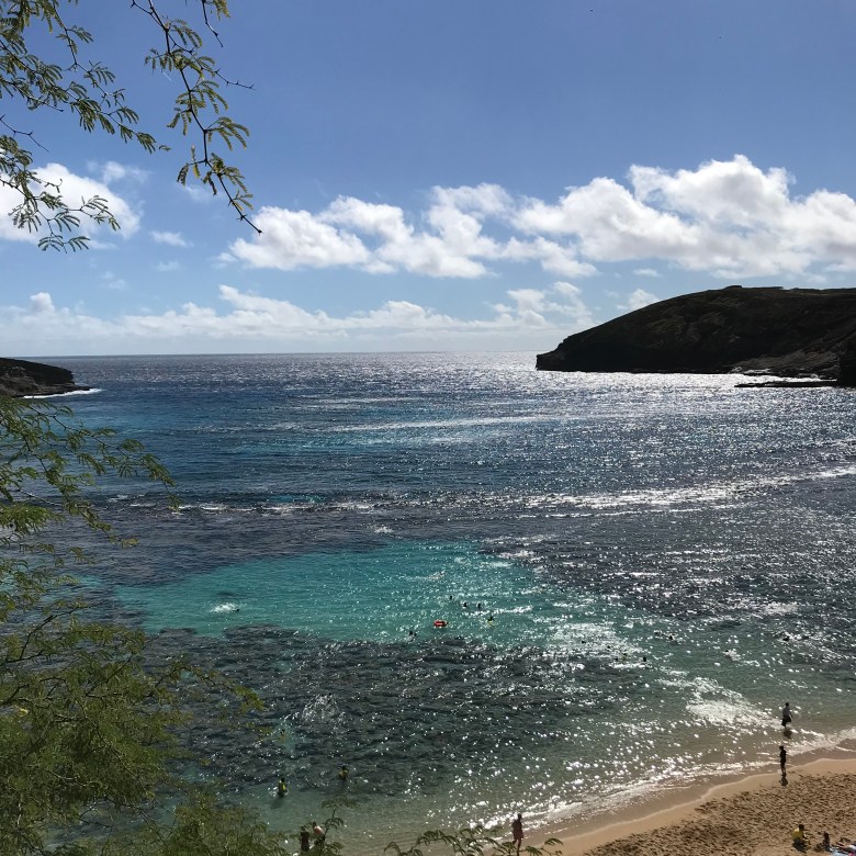 Thursday, we spent the day in Hanauma bay, which isn’t far from Waikiki, and it’s another highlight of the trip. It’s a protected coral reef where you can hire snorkels and fins, and just observe the wildlife. There are points in the bay where you can spot the sea turtle colonies – though we didn’t manage to see them on our visit. It’s a very wide bay – but for a long way out, it’s quite shallow due to the reef.
