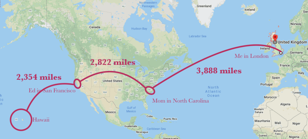 It’s always a real challenge for my family to see each other. We’re so spread out… almost as if we couldn’t get far away enough from each other when we all started moving after college. From New York, my brother Ed and his family moved out to the West Coast, to California; my mom on the East Coast, moved south, to North Carolina; and me, I moved even further east, to London. The distances are staggering – which usually makes for seeing everyone in person a once-in-a-year event.